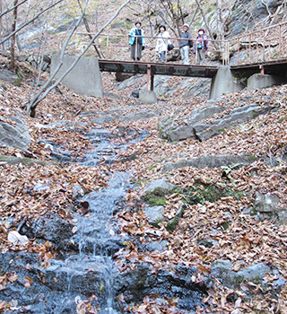 登り初めはスギの森。日差しの遮られる登り道をゆっくりと進む。紅葉を見せる広葉樹は、道に沿って流れ落ちる渓流沿いに点々と続き、正に「マツ(ここではスギ)を彩るカエデやツタ」の歌の文句そのものです。